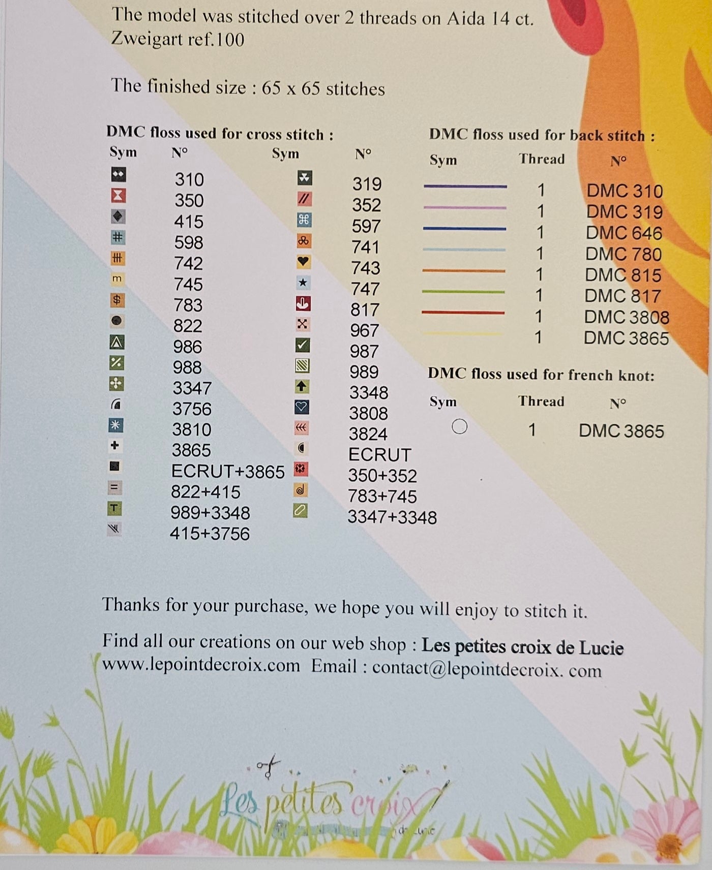 Please see photo for design size abd floss suggestions.