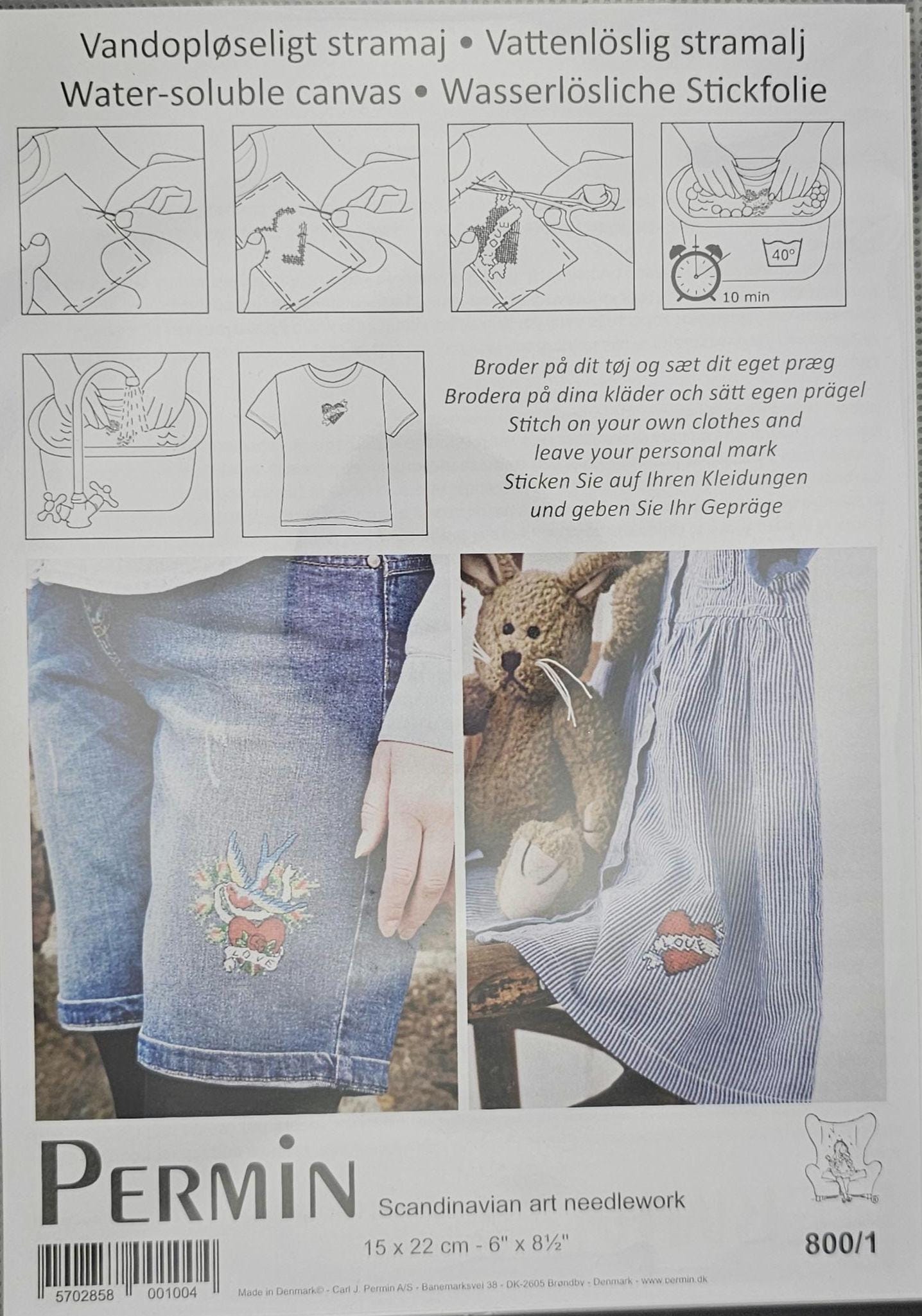 Are you ready to add some flourish to those drab denims? Bring an added touch of love to the infant dress? Customize the newly weds kitchen towels? Here's the tool you need! 6" x 8 1/2" sheets can be cut to size or used wholly to add your favorite design to any washable item. Canvas dissolves in water after soaking for 10 minutes.